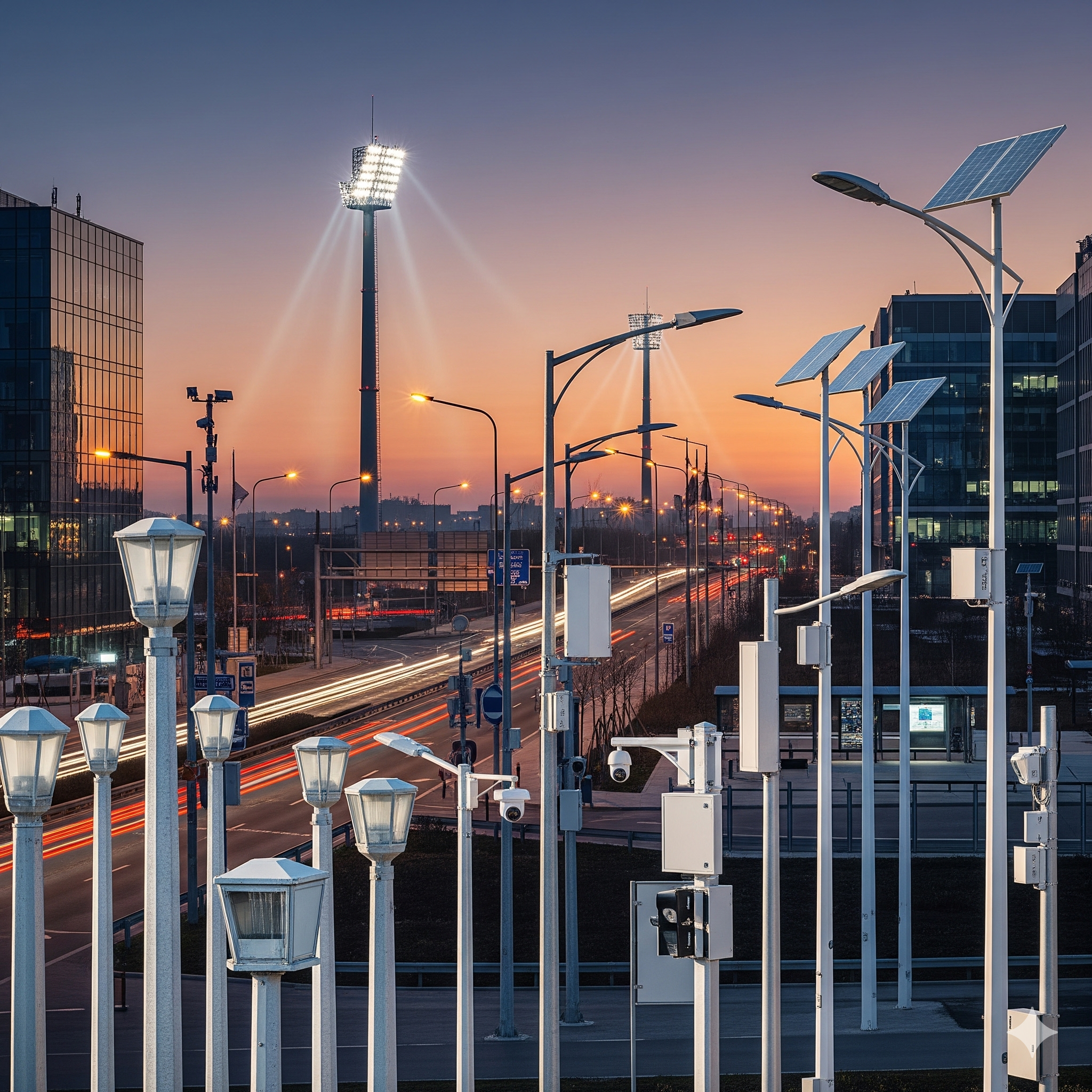 Advanced smart poles integrating lighting, surveillance, communication, and smart city technologies.
